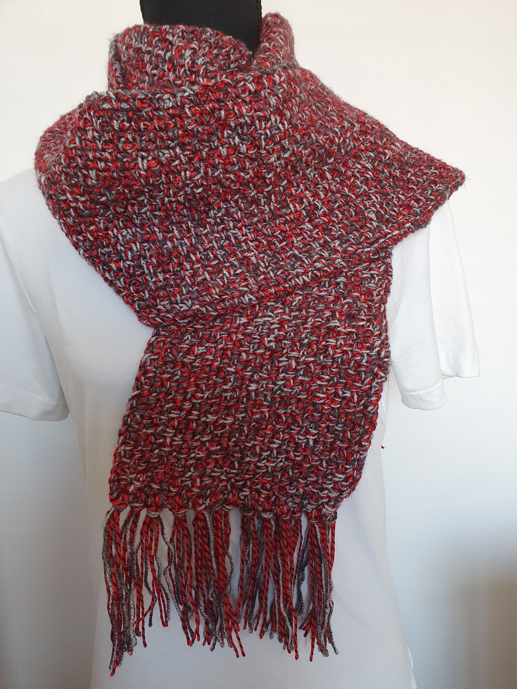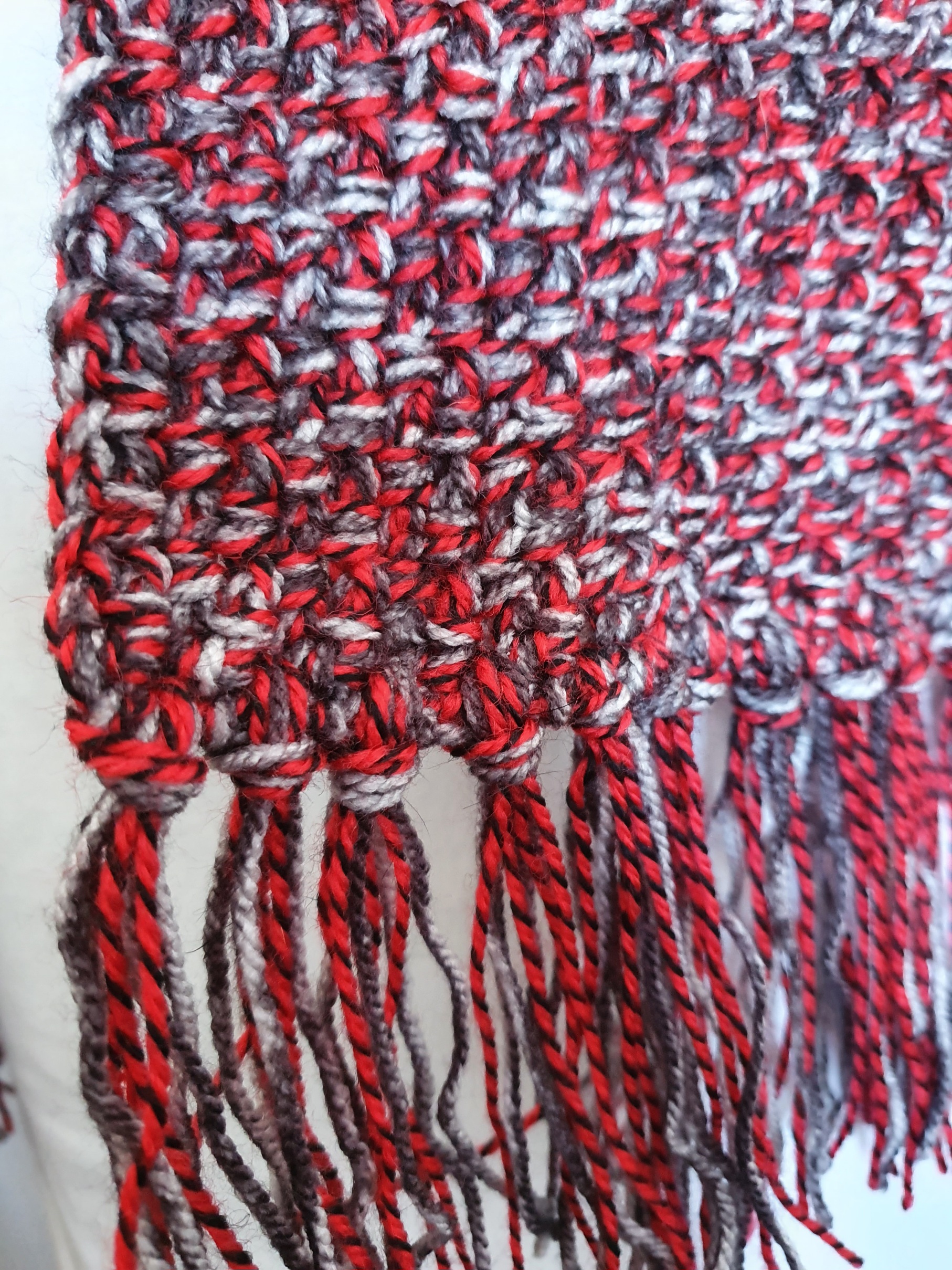 Gehaakte sjaal rood zwart met franjes