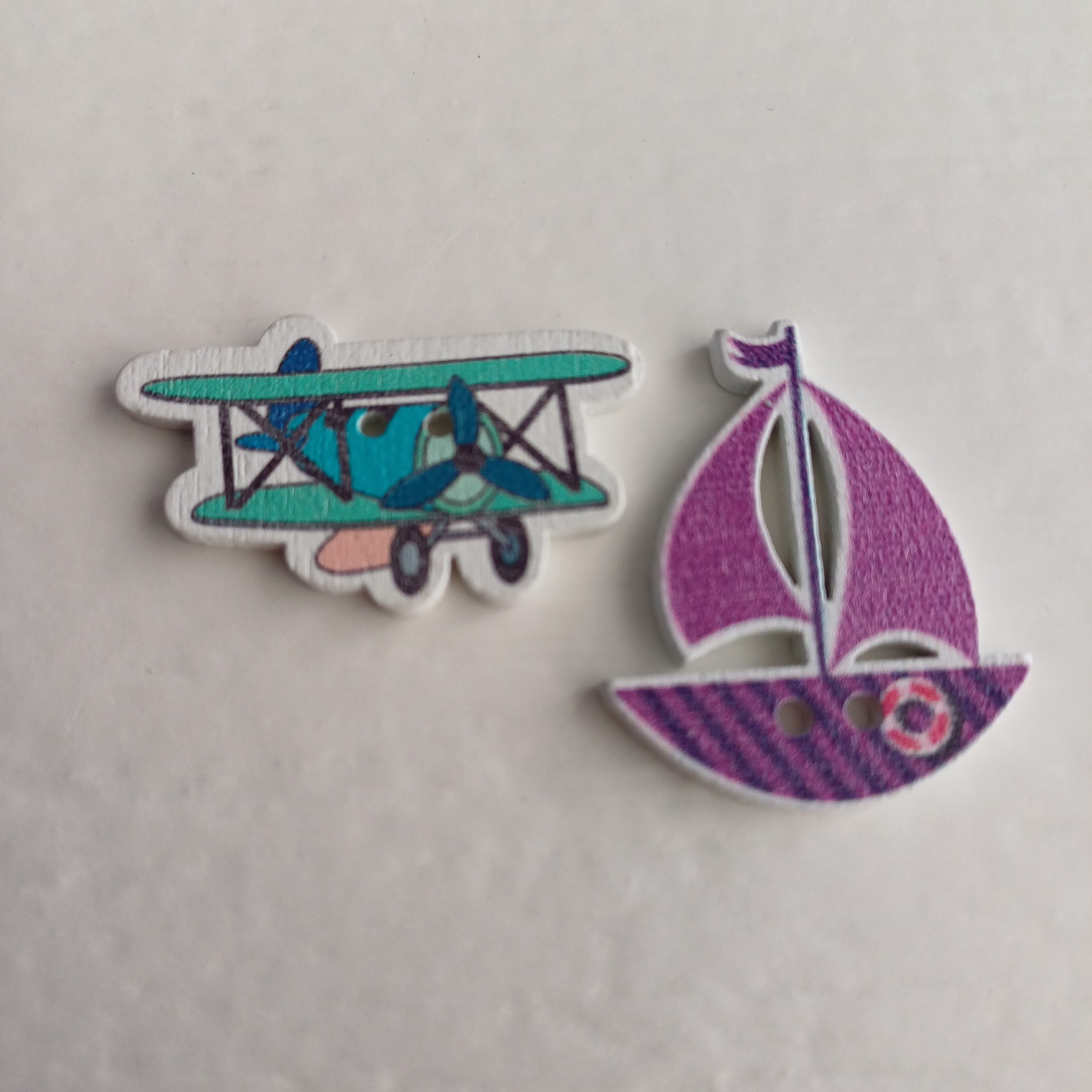 Houten knopen vliegtuig en zeilboot 2 stuks