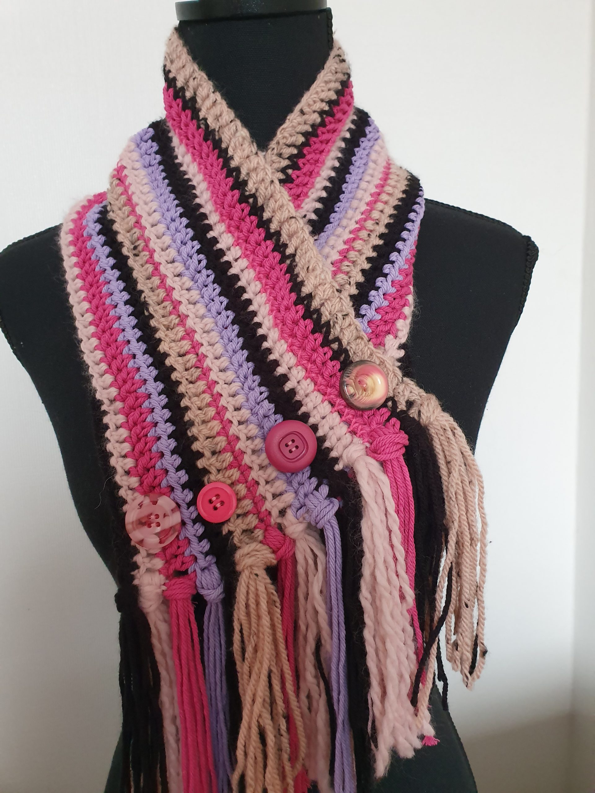 Roze col met knopen en franjes
