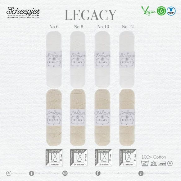 Scheepjes Legacy glanskatoen nr. 12 is een eerbetoon aan het verleden en is bij uitstek geschikt voor het maken van projecten die de tand des tijds moeten trotseren. Dit garen van gemerceriseerd katoen is verkrijgbaar in de klassieke tinten wit en naturel ecru en onderscheidt zich door de gave gladde draad en subtiele glans. Scheepjes Legacy is ook verkrijgbaar in een variant van 100% zuiver katoen, met een natuurlijk matte uitstraling. Beide uitvoeringen zijn heerlijk zacht, ademend en profiteren van een grotere dichtheid en twijning dan andere katoenen garens.